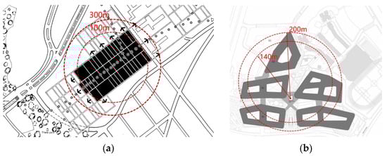 Accordingly, grid-type campuses adopt the “neighborhood unit” design concept from New Urbanism (Figure 4), setting a 5-min walking distance (approximately 400 m) as the range with high accessibility. Walking distance thus serves as the basis for modular selection in campus planning, ensuring that the spatial layout meets the feasibility needs of faculty and students while fostering opportunities for serendipitous encounters among members of different disciplines, thereby promoting interdisciplinary communication.
