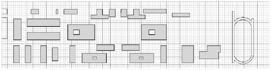 Campus grids can be categorized as either explicit or implicit. An explicit grid refers to a campus planning mode where buildings and roads are arranged strictly in accordance with modules, with the lines and order of the grid clearly manifested in the spatial form. In this mode, road orientations maintain a consistent parallel or perpendicular relationship with building boundaries, and the overall layout exhibits distinct regular grid-like characteristics—typical cases include the Free University of Berlin and Paris Diderot University (Figure 15a). By contrast, an implicit grid denotes a planning strategy where grids serve as latent control tools for regulating the campus’s overall scale and functional zoning during the planning phase. Here, the layout design of roads and buildings does not strictly adhere to a perpendicular or aligned relationship, and grid lines are not directly perceptible in the spatial form—typical cases include the Qatar University and University of Duisburg-Essen (Figure 15b). When the grid serves as an explicit design strategy that defines the overall structural orientation of the campus and guides the planning logic of the building complex, the grid unit modules tend to be larger, typically ranging up to 90 m on the longer side and 80 m on the shorter side (Figure 16). Conversely, when the grid operates as an implicit design technique, decomposing into repetitive units that collectively form ordered, rhythmic, or patterned architectural forms, the grid unit modules are smaller, typically between 7.2 and 10 m (Appendix A Table A1). To foster interdisciplinary exchange, grid-type campuses emphasize horizontal expansion of teaching buildings, resulting in building heights typically not exceeding seven stories (Figure 17). Grid units in these campuses may take various shapes, such as rectangular, diamond-shaped, and octagonal (Figure 18). Combinations of these forms contribute to diverse campus grid configurations.