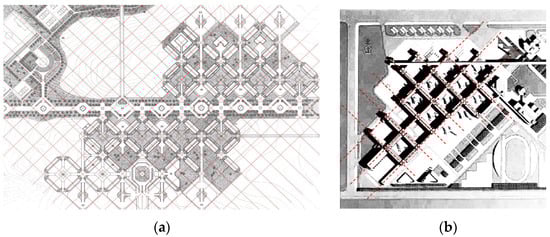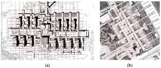The application of the aforementioned modular system in university campus planning traces its origin to the systematic inquiry into spatial scale and order organization within the domains of urban planning and modern architecture. In the context of urban planning, the Cerdà Plan for Barcelona, as early as 1860, employed a grid structure for urban expansion planning. To achieve a balance between public health and transportation accessibility in spatial layout, Cerdà subdivided the expanded urban blocks into grid units with dimensions of 113.3 × 113.3 m []. In the early 20th century, Le Corbusier also incorporated the modular system as the core methodology for urban scale organization in his “Radiant City” concept; at the architectural level, he further proposed the renowned “Modulor” theory, which established a unified system for size and proportion control grounded in human body scale []. In the realm of modern architectural design, the proposal for the Venice Hospital put forward by Le Corbusier in 1965 adopted a grid layout capable of reconciling the urban fabric while catering to future expansion requirements. Despite the ultimate non-implementation of this proposal, its underlying concept exerted a profound influence on subsequent grid-based spatial design (Figure 1) []. Consequently, as the core logic permeating the dual scales of architecture and urbanism, the modular system has been extensively applied across diverse types of spatial environments. This widespread application underscores its distinctive advantages.
