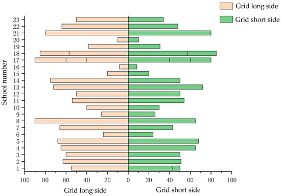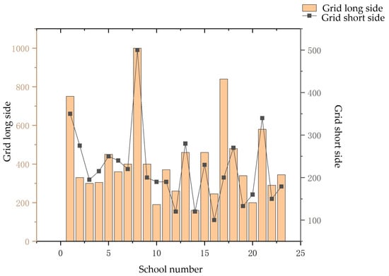 Statistics of long and short sides of grids in campus planning (School numbers refer to Appendix A.1. The raw data are provided in Appendix A.1).