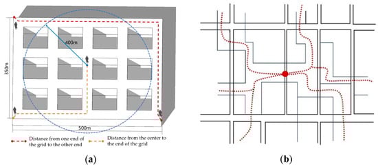 (a) Schematic diagram of suitable walking distances for grid-type universities; (b) Varying paths in grid-type universities promote interdisciplinary communication.