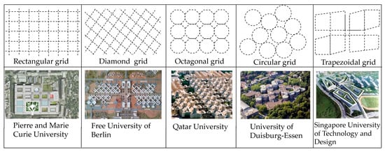 University campuses serve as the core spatial carriers for the implementation of higher education activities. As one of the vital types of university campuses [], grid-type university campuses represent a networked spatial organizational form constructed by continuous building units and road network systems, with specific modular control as the foundation. Among these components, the modular system occupies a central position in the design of such grid-type campus. In campus master planning, modules not only exert a regulatory function on the scale division and functional layout of the campus grid—facilitating the optimization of walking distances and traffic flow organization—but also provide crucial support for the sustainable growth of campus space. In architectural design, modular design enables the establishment of a unified column grid system: on the one hand, it provides a basis for prefabricated building production, significantly enhancing construction efficiency and construction quality control capabilities; on the other hand, by virtue of its spatial flexibility and rational layout, it plays a key role in optimizing the academic communication environment. The aforementioned characteristics are highly aligned with the development needs of contemporary higher education, endowing grid-type university campuses with significant research value and broad application prospects in the field of future educational space planning.