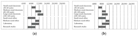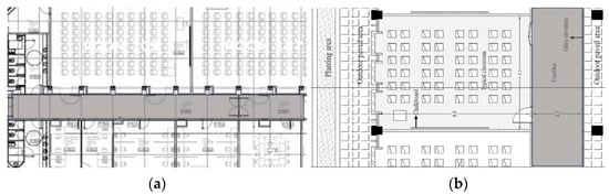 The design of individual buildings within grid-type campuses typically features repetitive geometric forms, where modular control of the grid establishes a sense of order. To enhance ventilation and natural lighting, buildings connected by the same geometric unit often incorporate courtyards. The building grid width is defined by subtracting the courtyard width. Generally, influenced by factors such as classroom furniture arrangement, class size, and column networks, the depth of large lecture halls ranges from 8 to 11 m, with spans between 10 and 14 m (Figure 19). Smaller classrooms or research rooms have depths of 5 to 10 m, while corridors are typically 2 to 4 m wide. Corridor layout notably impacts the width of the building grid. For example, in parts of Pierre and Marie Curie University’s floor plan, an internal corridor arrangement places 80-person classrooms and research rooms along both sides, forming a grid width of approximately 18 m (Figure 20a). In contrast, the first-floor layout of Jordan University of Science and Technology employs a single-sided external corridor design, with classrooms accommodating about 48 students each, measuring 7.1 m × 8.2 m, and corridors 2.7 m wide, resulting in a grid building width of roughly 14 m (Figure 20b).