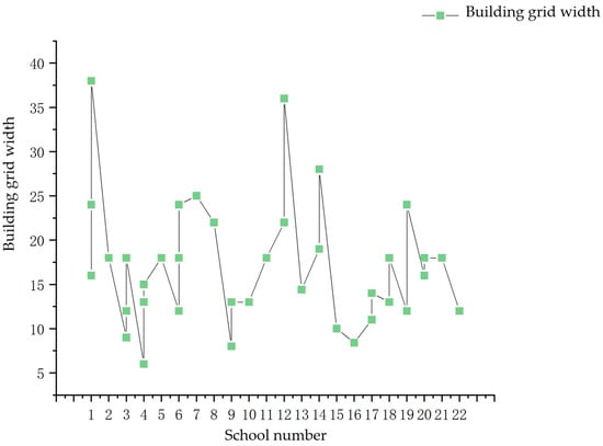 Statistical analysis of building spatial design data from grid-type university campuses reveals that external corridor layouts correspond with narrower grid widths, generally ranging from 7 to 14 m, whereas internal corridor layouts typically yield grid widths between 12 and 18 m (Figure 21; Appendix A.3). Given that building modules directly affect the overall campus modular, it is crucial during the initial design phase to coordinate campus planning, grid unit sizing, and building module dimensions to achieve an appropriate campus scale.