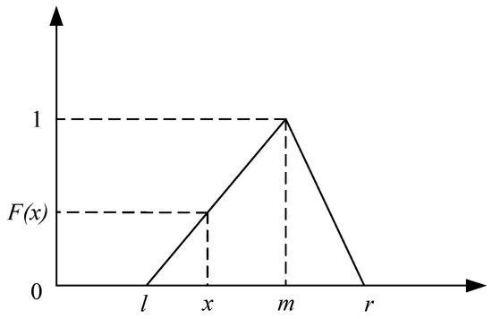 In addition, to minimize subjectivity in expert evaluations, fuzzy set theory was introduced by applying triangular fuzzy numbers (TFNs) to process expert scoring data [18,19]. A TFN is defined by three parameters—minimum value, most likely value, and maximum value—which together describe the fuzziness of the object under study. Formally, in the real number domain, a fuzzy number with membership function F(x) is called a triangular fuzzy number if it satisfies the condition expressed in Formula (2).