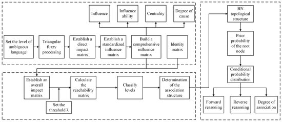 For the safety risk factors in the TBM construction process of hydraulic tunnels, the DEMATEL method is utilized, integrating expert knowledge. A comprehensive influence matrix is established based on triangular fuzzy numbers to calculate the influence degree, affected degree, centrality and cause degree, and analyze the causal attributes and importance distribution of the factors [20]. Secondly, the ISM method is applied to convert the comprehensive influence matrix into a standard reachability matrix, and a multi-level hierarchical risk correlation structure model is constructed to clarify and structure the complex factor relationships and reveal the interaction paths among various risk factors [21,22,23]; Map the risk association structure to the BN topological structure and, with the help of the reasoning function of the BN model, represent the association degree between nodes in terms of probability distribution information [24]. The flowchart of Safety Risk Correlation Analysis for Hydraulic Tunnel TBM Construction is illustrated in Figure 2.
