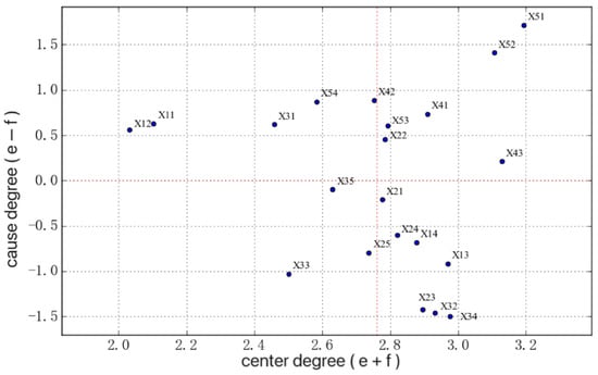 - According to the above calculation results, draw a risk index causality diagram with centrality as horizontal axis and causation as vertical axis, as shown in Figure 3. Centrality indicates the comprehensive influence of factors in the system, and the larger the value, the more significant the overall influence of the factor on the system; when the causation degree is positive, it is classified as cause factor, indicating that the factor has greater influence on other factors, and vice versa, it is classified as result factor.