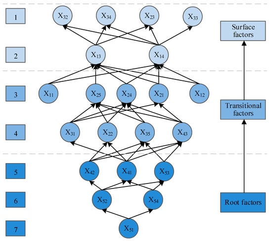 According to the reachability matrix hierarchy analysis procedure described above, combined with matrix K, risk factors are divided into 7 levels, the first level is , the second level is , the third level is , the fourth level is , the fifth level is , the sixth level is , and the seventh level is . Each level is further divided into root factors, transition factors and surface factors according to the meaning and expression form of factors. Root factors include factors at levels 5, 6 and 7, transition factors include factors at levels 3 and 4, and surface factors include factors at levels 1 and 2. Directed connection lines are drawn in combination with the position of “1” in the reachability matrix K, and redundant cross-level transmission paths are removed for transitivity simplification to finally determine the risk association structure, as shown in Figure 4.