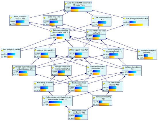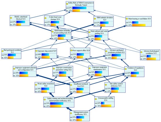 - Positive causal reasoningBased on the discussion in Section 3.3, the occurrence probabilities of risk factors were assessed by integrating expert knowledge, historical experience, TBM construction case data, and professional expertise. According to the prior probability grading criteria for root nodes and the corresponding fuzzy numbers, experts’ natural language evaluations were processed using Formulae (4) and (11). This yielded the prior probabilities for root nodes including X11 adverse geological conditions, X12 unfavorable hydrogeological conditions, and X51 inadequate management systems. For non-root nodes, the Noisy-or gate model was employed to calculate the probability of child nodes occurring under any given parent node state, thereby generating the conditional probability tables (CPTs).In the GeNIe4.1.3402 software, the calculated probability parameters were input into the corresponding nodes of the Bayesian network (BN) model for safety risk analysis of hydraulic tunnel TBM construction, completing the parameter learning process. Through forward causal inference, the posterior probability distributions of 18 risk factors were obtained. The occurrence probability data of all factors were then exported and summarized, with the inference results presented in Figure 5.