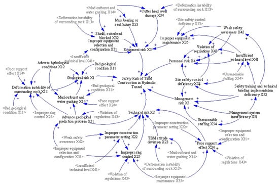 According to the determined system boundary and association structure, the causal relationship of risk factors within each subsystem and among subsystems is obtained, the subsystems are divided in turn, and the causal relationship diagram of total system safety risk of hydraulic tunnel TBM construction is drawn by Vensim software, as shown in Figure 7.