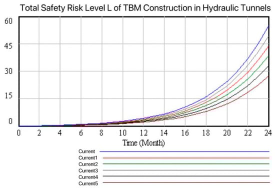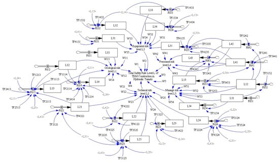 To further analyze the evolution trend of safety risks in TBM construction of hydraulic tunnels, combined with system requirements, based on the causal relationship diagram, the risk level Lxy of factors in each subsystem is set as the state variable, and the risk level increment Rtxy is set as the rate variable. The overall system risk level L and the risk levels L1–5 of each subsystem are auxiliary variables. According to the numbering in the safety risk indicator system for hydraulic tunnel TBM construction, the factors were encoded, and a stock–flow diagram of safety risks in hydraulic tunnel TBM construction was developed using Vensim software, as shown in Figure 8.