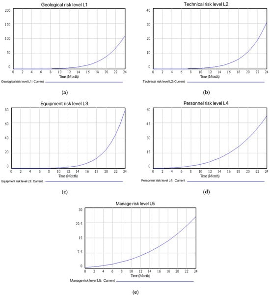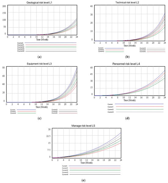 Figure 10. Evolution trend of subsystems. (a) Trends in geological risk evolution. (b) Trends in technological risk evolution. (c) Evolution trend of equipment risks. (d) Trends in personnel risk evolution. (e) Managing risk evolution trends.