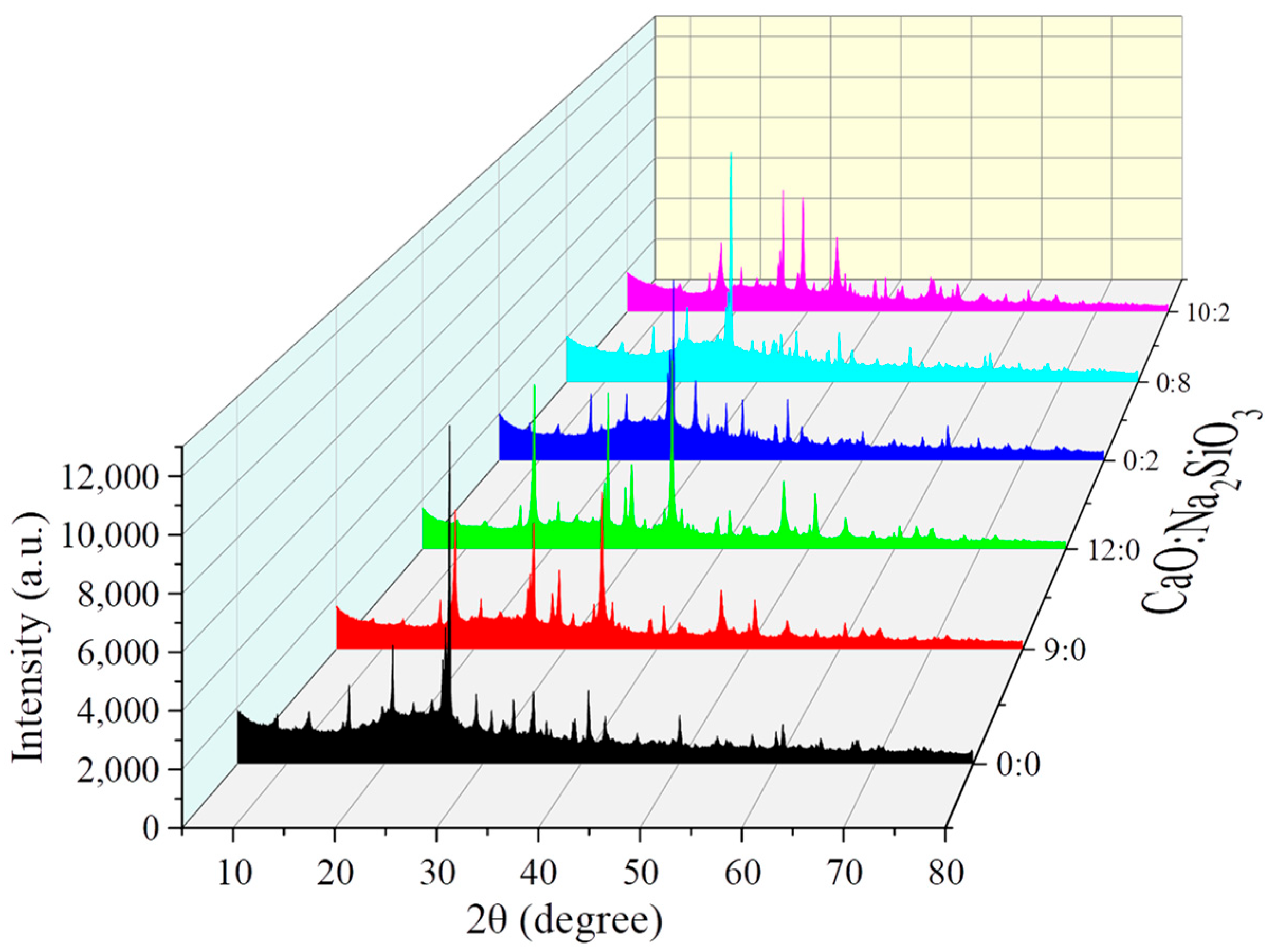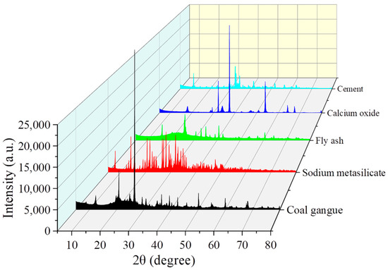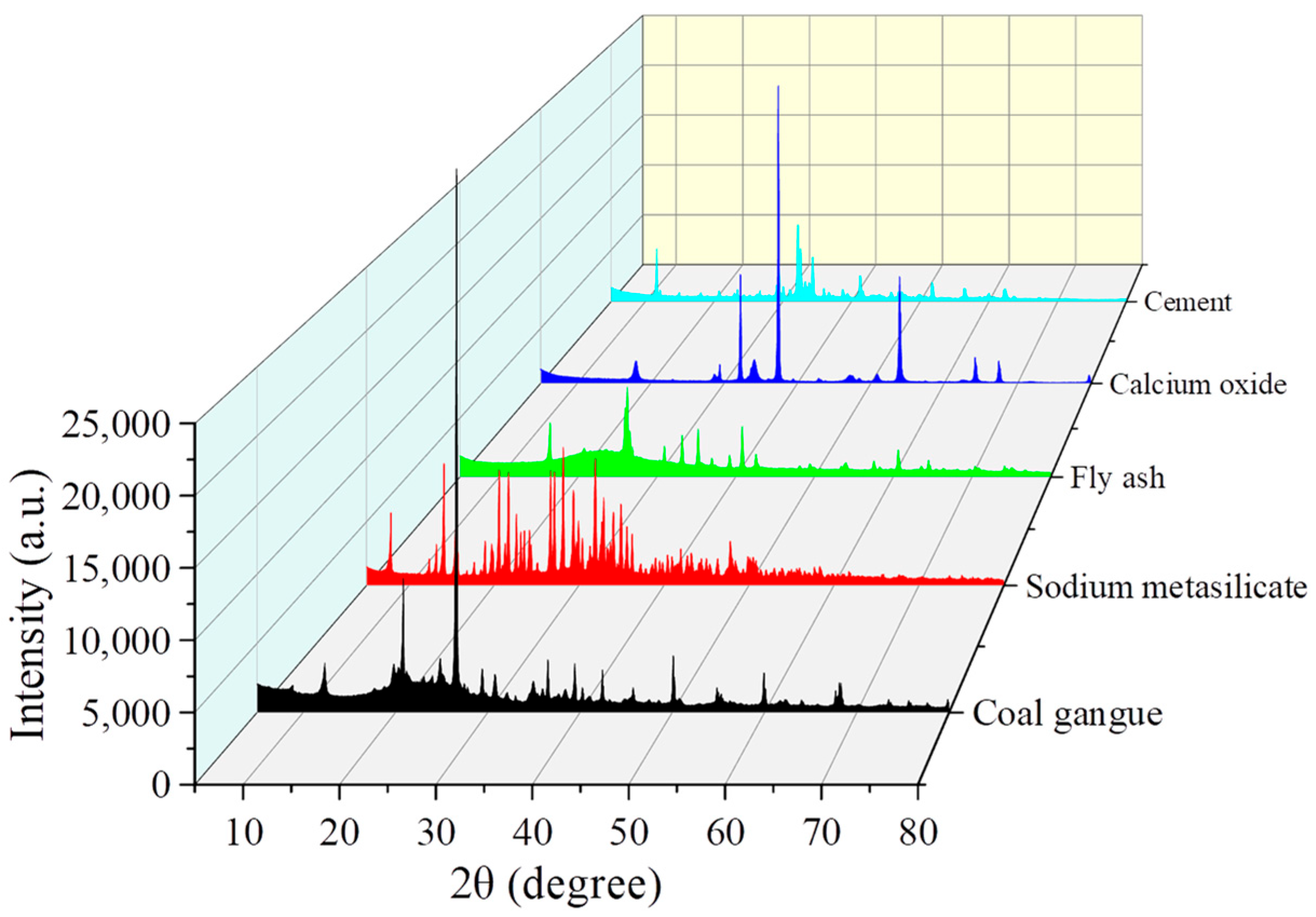 As summarized, a comparison of the crystalline phase structures of coal gangue, fly ash, cement, calcium oxide, and sodium metasilicate is presented in Table 2.