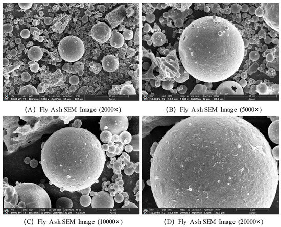 The SEM images of fly ash are presented in Figure 5. At a magnification of 2000×, the fly ash appears as an aggregate composed of particles with varying sizes, exhibiting a significant difference in particle diameters. The morphology is predominantly spherical, accompanied by a small number of irregular block-like particles. There are observable voids between particles, and localized agglomeration leads to the formation of a porous structure, resulting in an overall loose and heterogeneous texture. At a magnification of 10,000×, the surfaces of the spherical particles display microstructural defects such as small pits and cracks. Some particle surfaces are covered with nanoscale deposits, which are likely microcrystals formed via crystallization. The irregular particles exhibit rough surfaces with clearly visible pores, which may serve as active sites for chemical reactions. The interfaces between particles are more distinct at this scale, allowing the observation of inter-particle bonding modes and the degree of interconnectivity. At a magnification of 20,000×, the nanoscale features of fly ash particles become evident. The smooth spherical particles display predominantly amorphous characteristics, though localized crystallization is observed, including the presence of needle-like or plate-like microcrystalline structures.