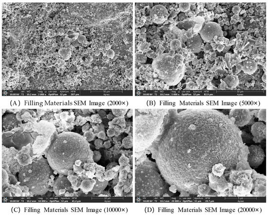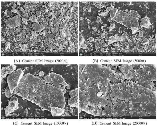 The microstructural morphology of cement was characterized using SEM, and the results are presented in Figure 6. The SEM images reveal that cement is a heterogeneous aggregate composed of various mineral phases. Its morphology is primarily characterized by numerous blunt-edged, ellipsoidal particles of varying sizes, exhibiting irregular shapes overall. At a magnification of 2000×, all visible particles appear to be smaller than 50 μm. At 5000× magnification, the surfaces of larger particles are observed to be smooth and flat, with a substantial number of smaller particles irregularly attached to them. At higher magnifications of 10,000× and 20,000×, many needle-like, rod-shaped, columnar, and ellipsoidal granular structures are clearly seen to be distributed and embedded on the surfaces of larger particles, approximately 20 μm in size.