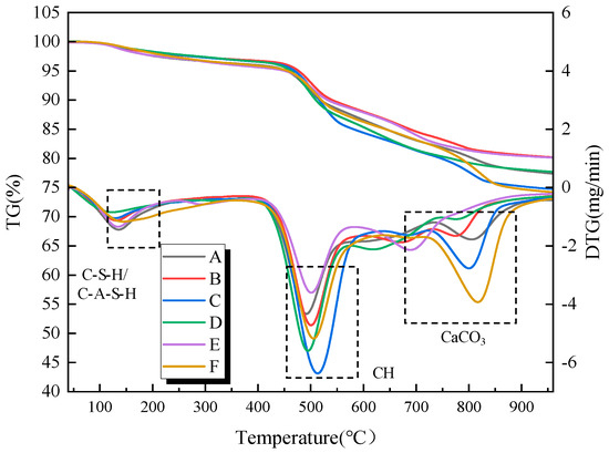 TG and DTG of the samples under the action of different alkaline activators at the 28-day curing age. A is no alkali activator, B is 3% CaO, C is 12% CaO, D is 2% Na2SiO3, E is 8% Na2SiO3, and F is 8% CaO + 4% Na2SiO3.