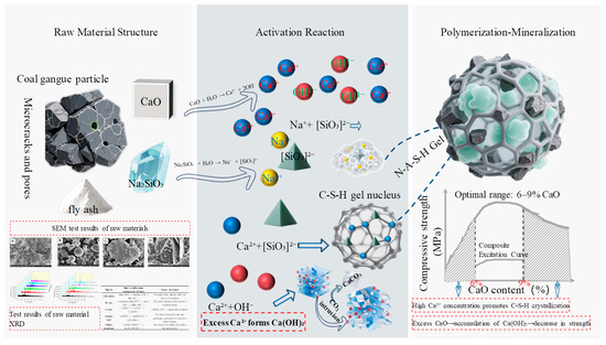 The reaction mechanism at the microscopic level reveals the essence of the synergistic effect between CaO and Na2SiO3 (Figure 15). The dissolution of CaO provides Ca2+ ions and elevates the system pH (~12–13), effectively disrupting the crystal structure of stable aluminosilicate minerals such as quartz and kaolinite in coal gangue, thereby promoting the dissolution and release of Si4+ and Al3+ ions. Simultaneously, the dissolution of Na2SiO3 not only provides additional OH− to maintain the highly alkaline environment but also introduces reactive SiO32− ions that directly participate in constructing the reaction network. At the optimal ratio (CaO:Na2SiO3 = 3:1), the high concentration of Ca2+ tends to undergo polycondensation reactions with the dissolved [SiO4]4− and [AlO4]5− tetrahedral units, predominantly forming a calcium-based hydrated aluminosilicate gel (C-A-S-H) with relatively high crystallinity and excellent mechanical properties. Its characteristic XRD peaks (29.5°, 32.0°) and dense structure observed under SEM are clearly discernible. Meanwhile, an appropriate amount of Na+ helps stabilize the dissolved aluminosilicate precursors, facilitating the early formation of the gel network. Excessive CaO leads to the accumulation of unreacted Ca(OH)2 (evidenced by prominent XRD peaks at 18.0°, 34.0°) and even carbonation to CaCO3 (peak at 29.4°), occupying space and weakening the matrix continuity. Excessive Na2SiO3 may, due to the high Na+ concentration, interfere with the effective coordination of Ca2+, inhibiting the preferential growth of C-A-S-H and instead promoting the formation of sodium-rich gel (N-A-S-H) with relatively weaker mechanical properties, or causing localized silicate enrichment. This competition and synergy at the ionic level ultimately determine the gel type, crystallinity, micromorphology, and consequently, the macroscopic mechanical performance.