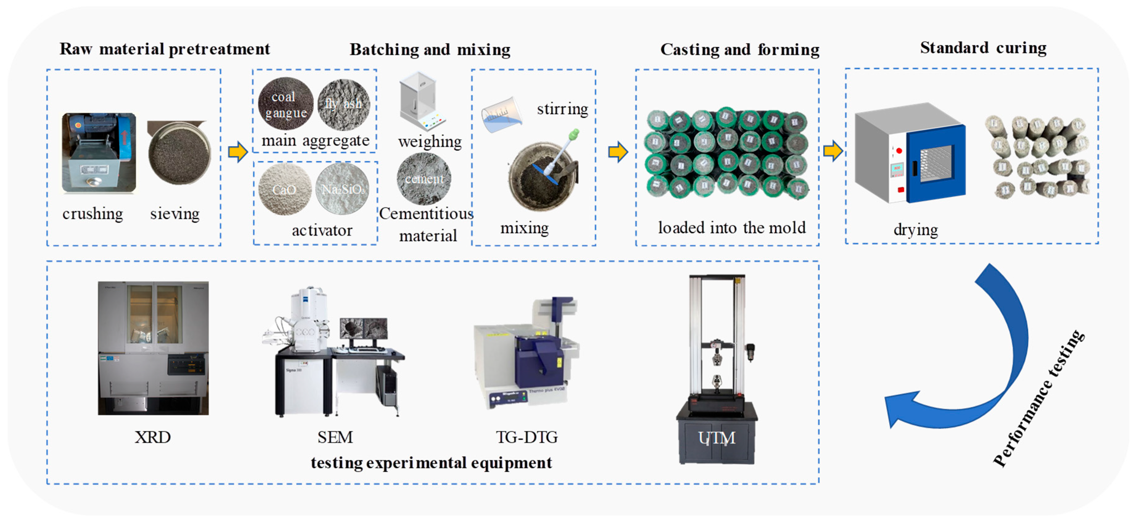 The microstructural morphology of the specimens at different curing ages—including gel phase distribution, crystalline phase characteristics, and pore structure—was observed using scanning electron microscopy (SEM, SIGMA 300, ZEISS, Oberkochen, Germany). The mineralogical composition of the geopolymeric phases was analyzed by X-ray diffraction (XRD, X’Pert PRO MPD, Panalytical, Almelo, The Netherlands) within a 2θ range of 5–60°. The relative content of specific phases was semi-quantitatively estimated based on characteristic diffraction peaks, such as C-A-S-H at 29.5°, N-A-S-H at 22°, and Ca(OH)2 at 18°. Thermogravimetric and differential thermogravimetric analysis (TG-DTG, TG-DTA8122, Rigaku Corporation, Tokyo, Japan) was performed from 30 °C to 1000 °C at a heating rate of 10 °C/min under a nitrogen atmosphere to evaluate the thermal decomposition behavior, gel phase stability, and crystallinity. Compressive strength tests were conducted using a universal testing machine (UTM, CMT6103, SASTest, Sansi Eternal Technology (Zhejiang) Co., Ltd., Ningbo, China) for all samples cured for 1 d, 3 d, 7 d, and 28 d. Each test group included three parallel specimens, and the average value was reported. The material preparation experimental process is shown in Figure 1.