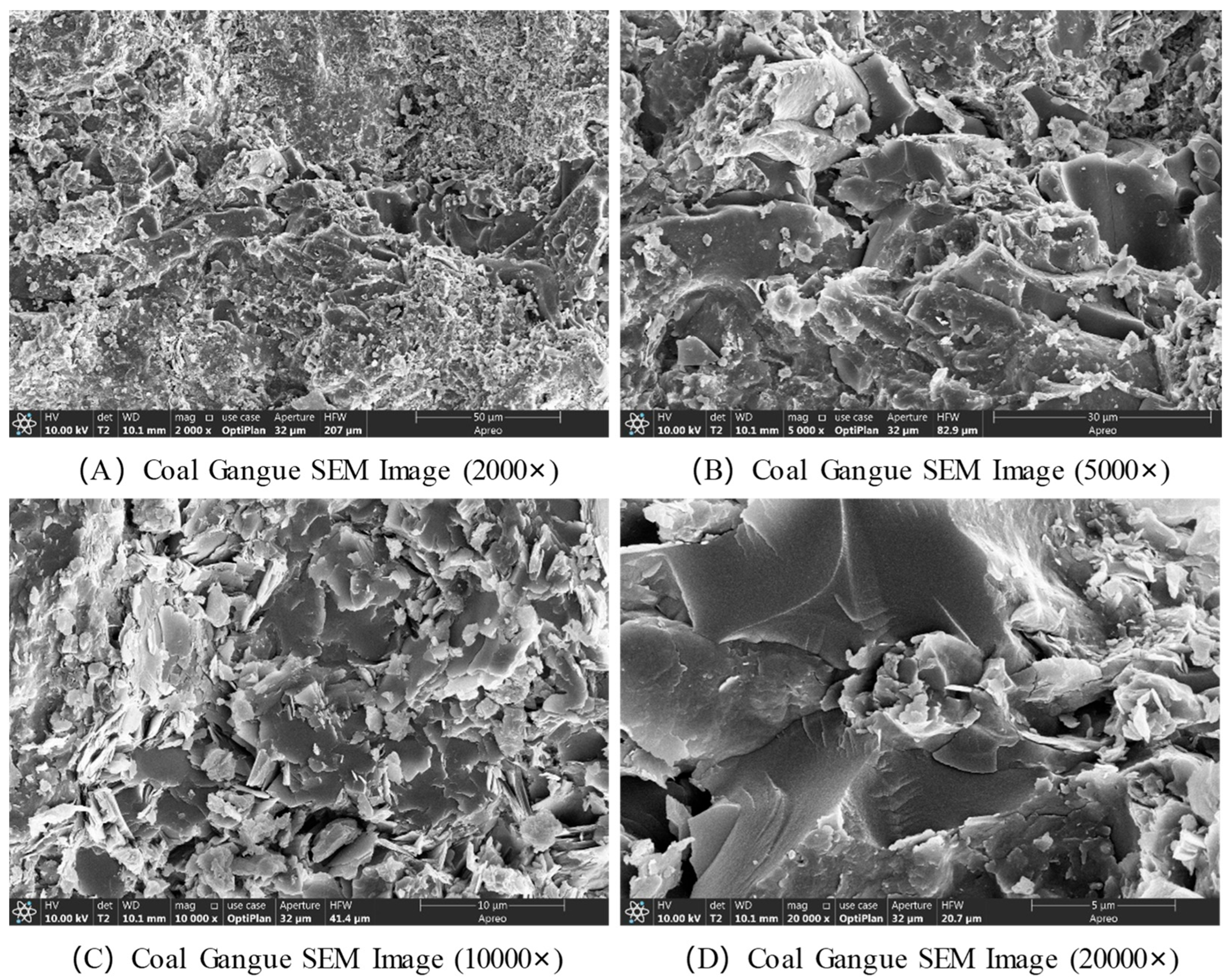 The microstructural characteristics of coal gangue were observed using scanning electron microscopy (SEM), with the results presented in Figure 4. At magnifications of 20,000× and 10,000×, the SEM images reveal many nanometer-sized particles, which are small crystals of mineral components such as quartz and kaolinite in the coal gangue. These crystals exhibit irregular shapes and varying sizes. Additionally, some nanometer-sized pores and cracks are visible on the surface, which likely result from weathering, erosion, or other processes during the formation or later stages of coal gangue. These pores and cracks provide pathways for gas and liquid adsorption and transport. Moreover, these cracks may influence the mechanical properties of coal gangue. At a magnification of 5000×, the SEM image shows that coal gangue is primarily composed of particles of varying sizes, with some gaps between the particles. At 2000× magnification, the SEM image clearly shows that coal gangue is an aggregate of particles with different diameters, ranging from several micrometers to tens of micrometers.