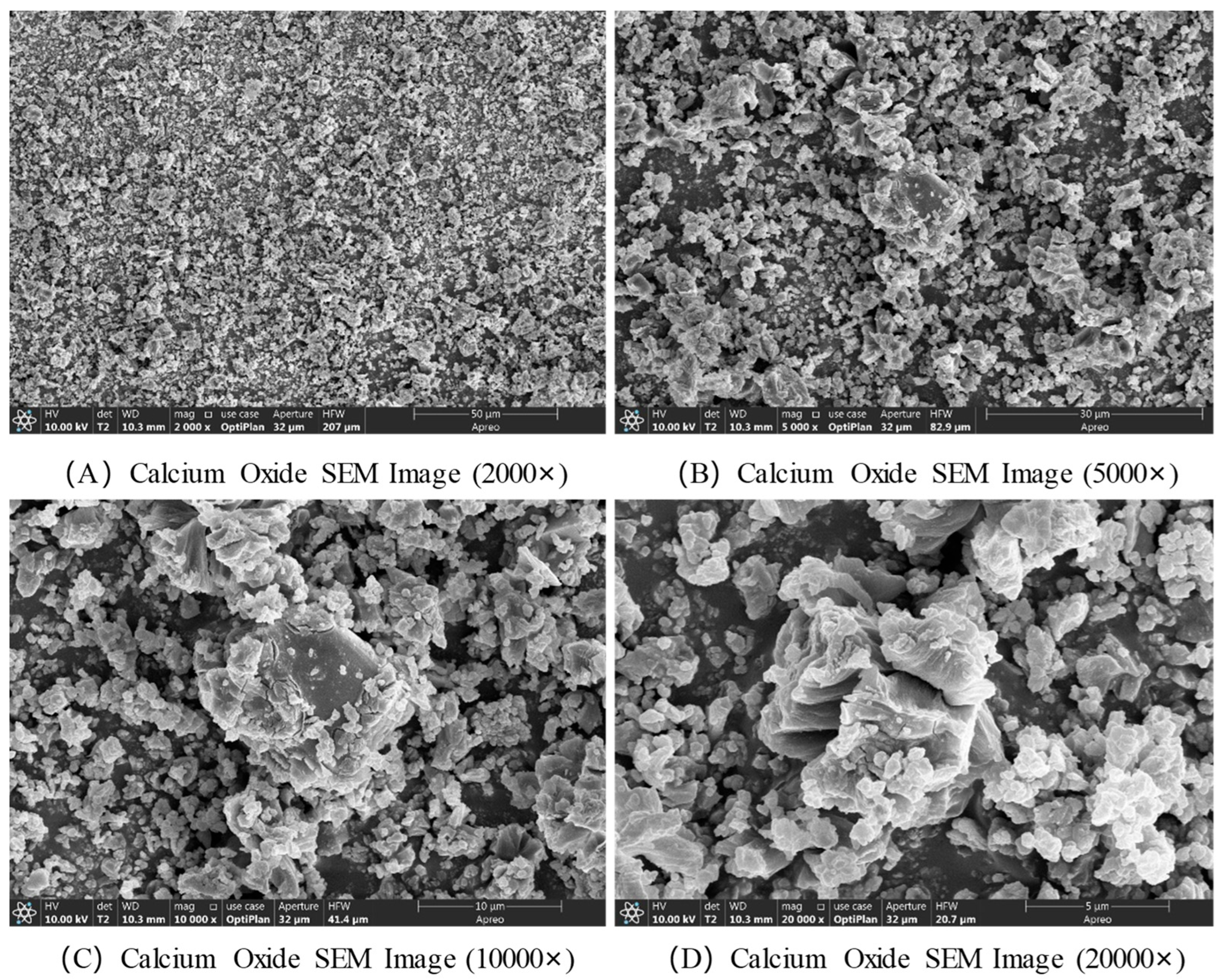 The SEM images of CaO are shown in Figure 7. At a magnification of 2000×, the SEM images reveal that the size of CaO particles is uneven, with irregular blocky or granular shapes. Significant gaps between the particles are observed, and in some areas, particle aggregation is evident, forming a porous structure. At a magnification of 5000×, the SEM images show that the particle surfaces are relatively rough, with some areas exhibiting uneven topography. The particles are composed of smaller aggregating particles, with tiny gaps between them, forming numerous small pores, which is consistent with the porous nature of calcium oxide. To quantify the specific surface area corresponding to this porous structure, the Brunauer–Emmett–Teller (BET) method was used to determine the specific surface area of the CaO powder employed in this study, and the result showed that its specific surface area was 23 m2/g. At 10,000× magnification, many micropores are visible, with varying sizes and shapes. Some particles also show cracks on their surfaces, likely due to stress changes during the preparation process or calcination conditions. Additionally, small nanometer-sized particles are observed to be attached to the surface of larger particles, which may be microcrystals formed during the crystallization process of calcium oxide. At 20,000× magnification, the SEM images clearly show the crystalline structure of the CaO particles, with observable edges and crystal faces.