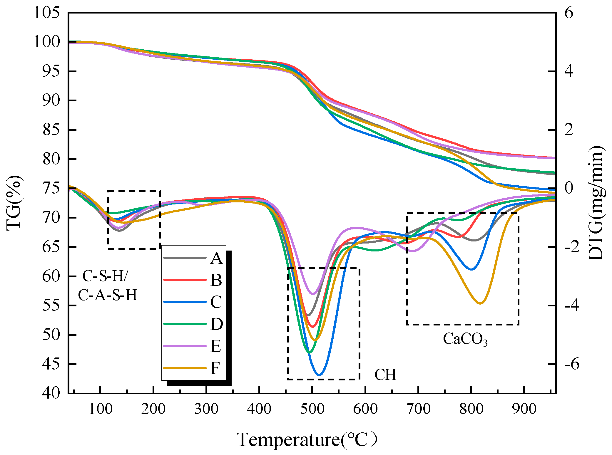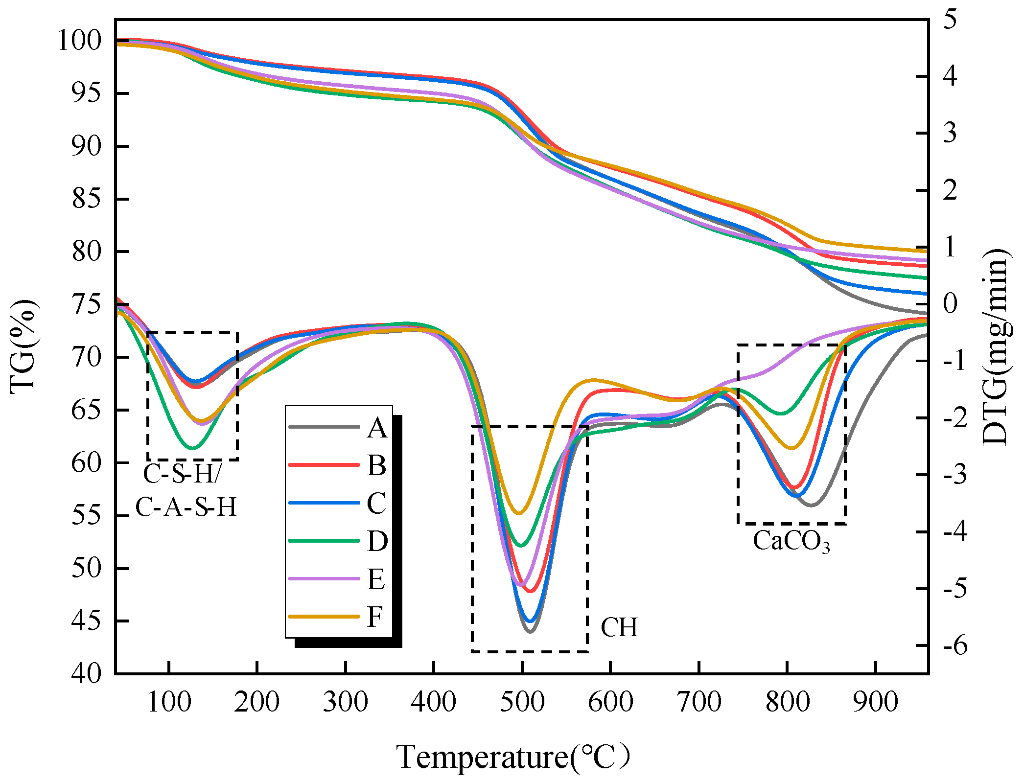 Figure 11. TG and DTG of the samples under the action of different alkaline activators at the 28-day curing age. A is no alkali activator, B is 3% CaO, C is 12% CaO, D is 2% Na2SiO3, E is 8% Na2SiO3, and F is 8% CaO + 4% Na2SiO3.