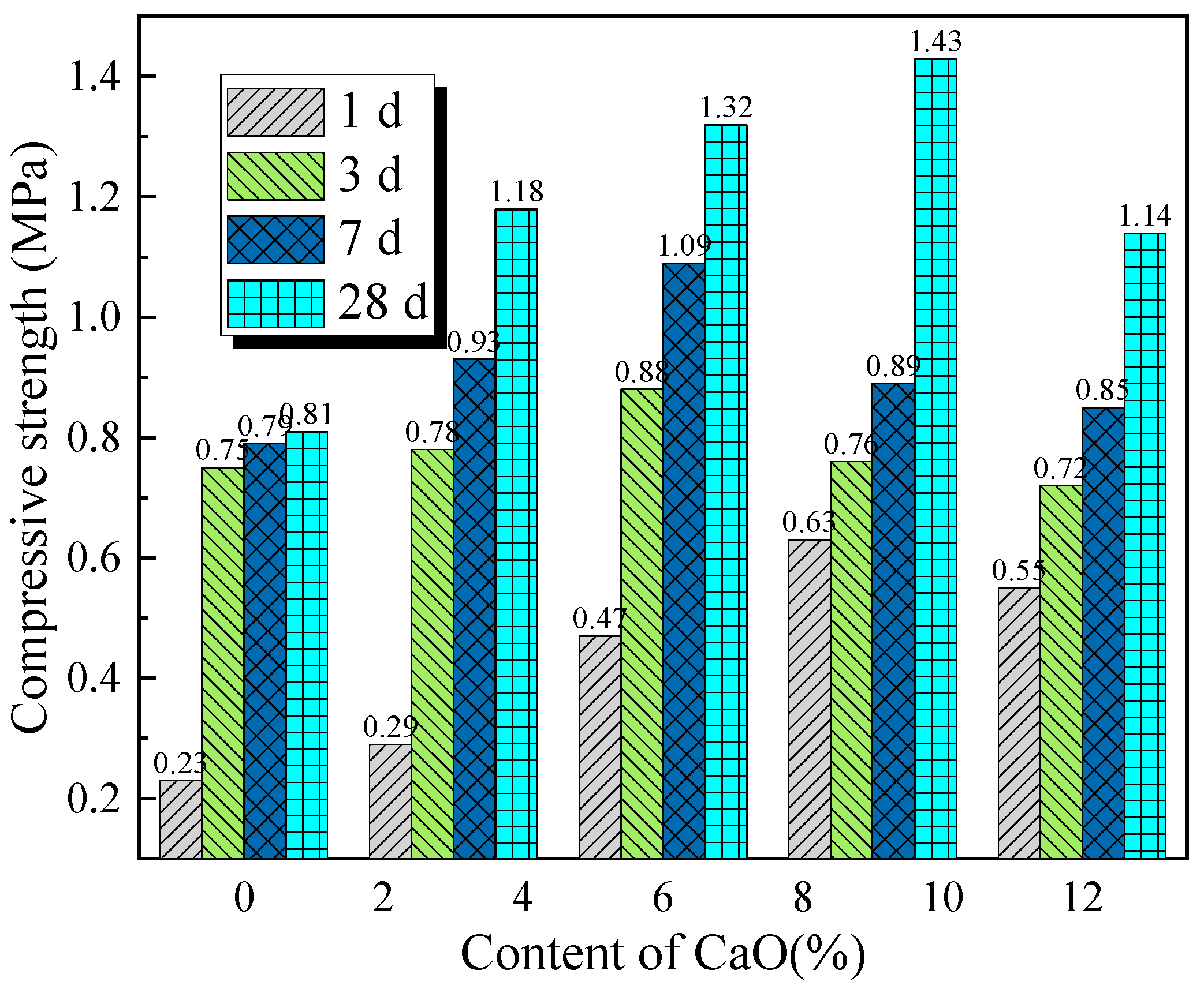 Figure 12. Effect of single-dose CaO activator content on compressive strength of backfill materials at different curing times.