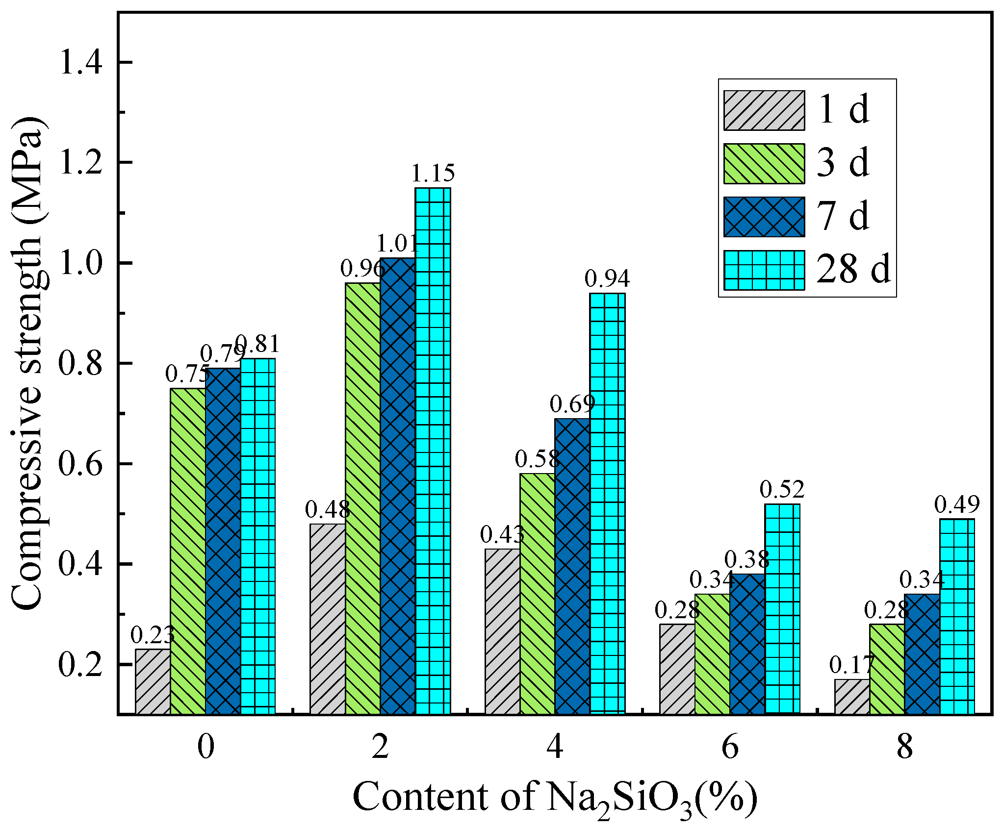 Figure 13. Effect of single-dose Na2SiO3 activator content on compressive strength of backfill materials at different curing times.