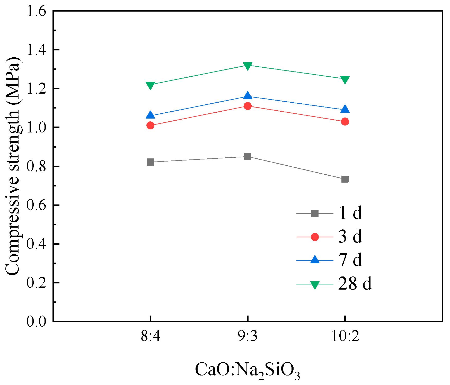 To investigate the effect of activator ratio on the compressive strength of the filling material samples, Figure 14 presents the variation in compressive strength with the activator ratio under different curing ages. As shown in the figure, under the same alkali activator content (12%) and curing age, as the ratio of CaO to Na2SiO3 increases, the compressive strength of the filling material samples first increases and then decreases. Therefore, by adjusting the activator ratio, the strength properties of the filling material samples can be optimized. The activator ratio that corresponds to the maximum compressive strength of the samples is 3:1, indicating that properly controlling the activator ratio can enhance the load-bearing capacity of the cemented backfill material and effectively mitigate the movement and deformation of the overburden in the goaf area. The reason for this behavior is that, although CaO and Na2SiO3 can synergistically activate the latent reactivity of coal gangue powder, leading to the formation of more hydration products, when the proportion of Na2SiO3 is too high, the free sodium ions react first with the reactive substances in the coal gangue powder, inhibiting the hydration of tricalcium aluminate, dicalcium silicate, and tricalcium silicate, thus reducing the formation of hydration products. On the other hand, when the proportion of CaO is too high, excess CaO reacts with carbon dioxide in the air to form carbonates, which deteriorates the strength properties of the backfill material. Additionally, the low solubility of CaO means that excess CaO, upon precipitation, also lowers the compressive strength of the filling material.