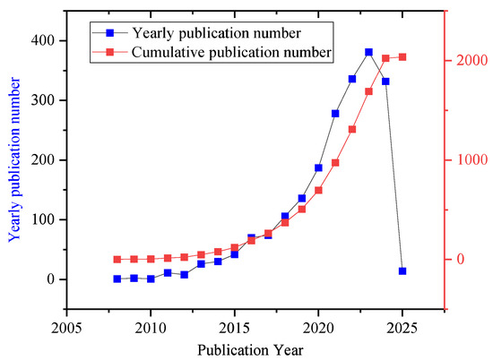 Annual publication volume and cumulative publication volume trend chart (2008~2025).