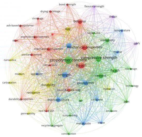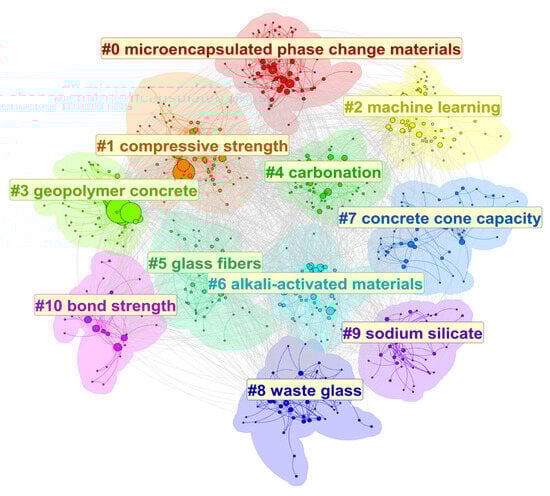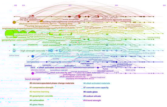 Figure 5 shows the keyword cluster distribution map. The numerical number represents the clustering and grouping of keywords, where Cluster #6 is located at the center of the network, connecting multiple research branches, indicating its pivotal role in the field. This cluster mainly covers the innovative application of alkali-activated materials in GPC preparation. Clusters #1 and #6 correspond to the two major research directions: “performance regulation” and “alkali activator optimization for performance regulation”. The former involves full-process control from raw material selection and mix design to curing conditions to achieve synergistic optimization of performance and workability; the latter focuses on improving active reaction efficiency by adjusting the type and concentration of alkali activators (such as sodium silicate, sodium hydroxide). Cluster #2 corresponds to application of machine learning in geopolymer material design.