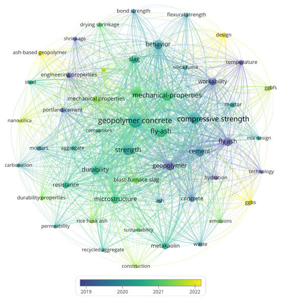 Table 1 lists the top 10 high-frequency keywords, with “geopolymer concrete” (1149 times), “fly ash” (749 times), and “compressive strength” (700 times) ranking as the top three. These keywords not only reflect the concentration of research focus but also reflect the complete technical chain from material source to performance evaluation.