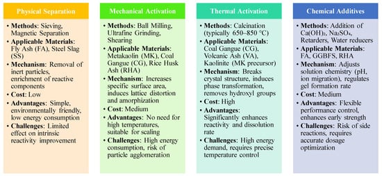 Nevertheless, challenges remain. Solid waste precursors vary widely in source, composition, and reactivity, which significantly influences key performance indicators such as setting time, workability, and mechanical strength. Moreover, the reaction mechanism of geopolymerization is not fully understood, and mix design is still largely empirical [15]. Long-term durability under diverse environmental conditions also requires further validation [16].