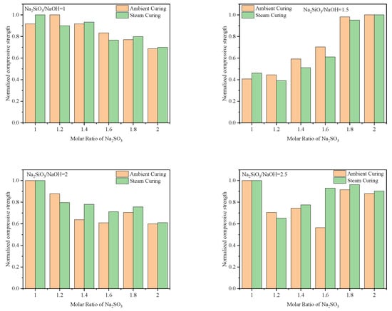 Influence of Curing Temperature: Elevated curing temperature is highly effective for accelerating early strength development in GPC. Moderately increased temperatures (typically 40–80 °C) significantly enhance alkali-activation kinetics, promoting gel formation, maturation, and densification, enabling high strength within a very short timeframe [21]. However, excessively high temperatures or rapid heating rates can induce internal thermal stresses and exacerbate moisture migration, potentially causing microcracking that compromises long-term strength and durability [22]. Therefore, optimizing the curing regime (temperature, duration, and heating rate) is critical for maximizing GPC’s early strength advantages while ensuring long-term performance.
