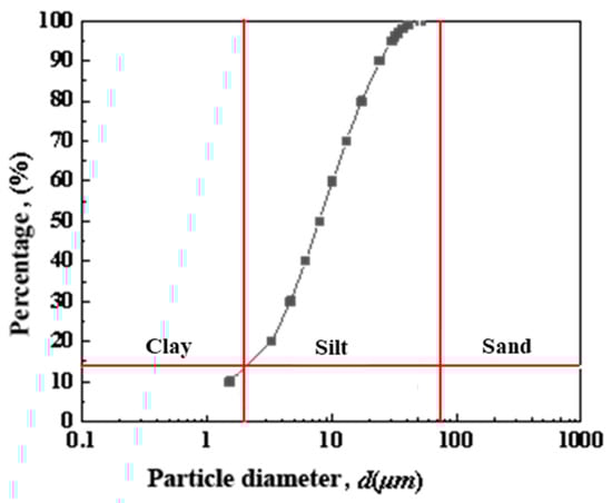 The particle size distribution of the remolded soft soil was determined using a particle size analyzer, as shown in Figure 2. Based on the particle size distribution results in Figure 2 and the Unified Soil Classification System [], the remolded silt in this study is classified as silty clay. This classification is supported by its particle size composition: the silt fraction (86.53%) is the dominant component, with a minor clay fraction (13.47%). This aligns with the USCS definition of silty clay, which requires silt content >50% and clay content between 10% and 30%.