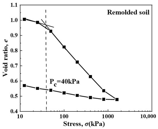 The study conducted multiple one-dimensional consolidation tests on the remolded soil. Figure 3 shows that pore deformation is not significant at low stress values, and the curve is relatively flat. As stress increases, a distinct inflection point appears on the compression curve. Based on the compression–rebound curve, the structural yield stress (preconsolidation pressure) was determined to be 40 kPa. The calculated compression coefficient of the remolded soft soil was 0.99 MPa−1, compression index was 0.329, and compression modulus was 1.843 MPa. The measured parameters collectively demonstrate the soil’s high compressibility.