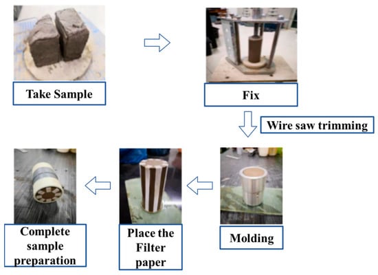 The preparation process of remolded soft soil triaxial specimens is illustrated in Figure 6, with the main steps detailed as follows: First, for specimen pre-trimming, cut a large block from the prepared remolded soft soil, with dimensions 5–10 mm larger than the target specimen size to allow subsequent trimming and avoid insufficient material. Second, conduct rough shaping by fixing the soil block on a soil trimming machine and using a wire saw to trim excess soil around the block from top to bottom, continuing until a cylindrical form with distinct, unbroken edges is formed (no soil fragmentation is allowed to prevent specimen damage). Third, perform fine trimming: use a sharp trimming knife to carefully scrape the edges of the preform along the vertical guide rod of the trimming machine from bottom to top, ensuring the specimen forms a smooth-sided cylinder with a diameter of 38 mm and height of 76 mm (height-to-diameter ratio = 2:1), which conforms to the standard for triaxial shear tests. Finally, carry out membrane assembly: (1) attach filter paper strips (width: 10 mm, length: 76 mm) vertically along the outer surface of the trimmed specimen—one strip every 120° around the specimen circumference—to facilitate pore water drainage during triaxial testing; (2) pre-inspect the rubber membrane (thickness: 0.2 mm) for defects (e.g., pinholes, cracks) under a light source and discard any membranes with defects to prevent pressure leakage; (3) cover the intact rubber membrane onto the inner wall of the membrane sleeve cylinder, carefully lower the specimen into the cylinder to avoid membrane damage, and finally seal both ends of the membrane with rubber O-rings (diameter: 38 mm) to complete the triaxial specimen preparation.