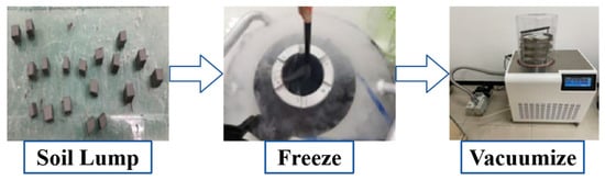 The microscopic test requires special sample preparation to ensure uncontaminated surfaces, structural integrity, and minimal deformation. Since the test must be conducted under high vacuum conditions, freeze-drying was adopted for sample preparation (Figure 7). To obtain stable structural observation surfaces, the specimen was sectioned into small blocks (approximately 12 mm × 12 mm × 10 mm) with flat observation planes. The samples were rapidly immersed in liquid nitrogen (−196 °C) for flash-freezing (10 min) to vitrify soil moisture into amorphous ice while preventing ice crystal formation. Subsequently, the samples were transferred to a pre-cooled (−80 °C) freeze-dryer, where vacuum sublimation drying was conducted at ≤5 Pa. Primary drying was maintained at −40 °C for ice sublimation, followed by gradual warming to 25 °C for bound water removal, ultimately yielding dry soil specimens with preserved original pore structures. This ultra-rapid freezing coupled with low-temperature vacuum sublimation effectively prevents structural collapse induced by conventional drying methods [].