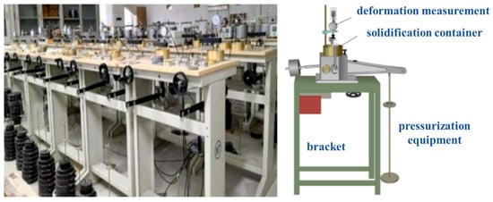 One-dimensional consolidation creep tests were conducted using a WG-2A dual-lever consolidometer (Jiangsu Shuyang Municipal Engineering Instrument Co., Ltd., Suqian, China), as shown in Figure 8. The specimen area was 30 cm2, specimen height was 2 cm, lever ratio was 1:12, and pressure range was 12.5~1600 kPa.
