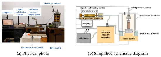 The triaxial creep test equipment used was the dynamic triaxial system (DYNTTS, GDS Instruments, Leicester, UK), as shown in Figure 9a. The system consists of an oil pump, confining pressure controller, servo motor, computer, Distributed Control System (DCS) signal conditioning device, back pressure controller, pressure chamber, etc. Figure 9b is a schematic diagram of the triaxial system. The oil pump fills and drains oil from the pressure chamber, controlled by the confining pressure controller. The drive system controls the servo motor to apply axial force. The back pressure controller provides back pressure. Data from the axial force sensor, pore pressure sensor, confining pressure sensor, and displacement sensor are transmitted to the computer via the DCS conditioning device. Main technical parameters are shown in Table 3.
