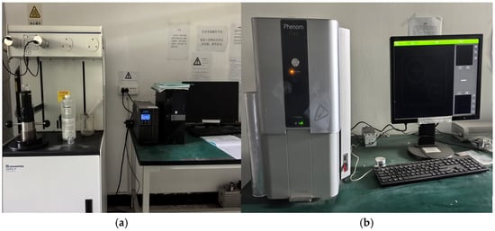 The main equipment used for mesostructural observation in this paper is shown in Figure 10—Figure 10a on AutoPore IV 9500 (Micromeritics Instrument Corporation, Norcross, GA, USA)mercury intrusion porosimeter (MIP) and Figure 10b on SEM (scanning electron microscope). Specific parameters of the MIP are listed in Table 4. The magnification range of the scanning electron microscope is 20–30,000 times, with a resolution better than 30 nm.