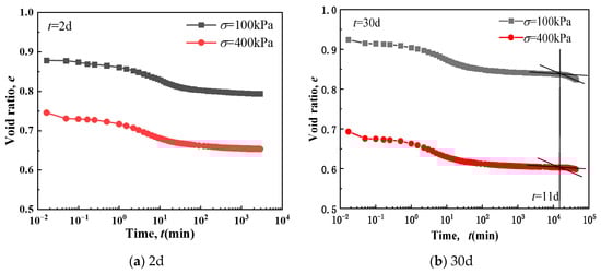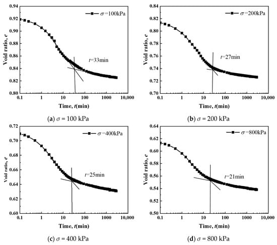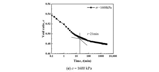 Figure 12 presents the void ratio–time relationships of remolded silt under different stress levels via stepwise loading. The results demonstrate a progressive decrease in void ratio with increasing load. The e-lgt curves of remolded silt under various stress levels all exhibit distinct inverse-S shapes with clear inflection points that demarcate the transition between primary and secondary consolidation. Soil mechanics principles indicate that the primary consolidation phase is characterized by an initially rapid decrease in void ratio, gradually transitioning to slower rates. The appearance of inflection points marks the onset of secondary consolidation, where the curves become nearly linear with minimal slopes. Experimental results revealed the transition times at vertical stresses of 100, 200, 400, 800, and 1600 kPa to be 33, 27, 25, 21, and 21 min, respectively.