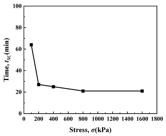 To further investigate the consolidation characteristics, Figure 13 presents the relationship between the secondary consolidation initiation time (tsc) and vertical stress. The results demonstrate a clear trend of decreasing tsc with increasing vertical stress. This behavior can be attributed to enhanced soil densification under higher stresses, which accelerates the primary consolidation process and consequently leads to earlier transition into the secondary process.