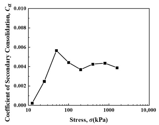 Figure 14 shows the relationship curve between the secondary consolidation coefficient and stress level. As shown in Figure 14, as vertical stress increases, the secondary consolidation coefficient first increases rapidly, then gradually decreases and finally stabilizes. The maximum value occurs near 50 kPa for the remolded soft soil, approximately 0.006. When the vertical stress is greater than 100 kPa, the secondary consolidation coefficient stabilizes around 0.004. There is a critical stress value: when the stress exceeds this value, the influence of stress level on the creep characteristics of remolded soft soil can be neglected in engineering analysis.
