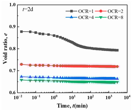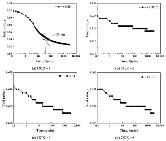 Figure 16 further presents the e-lgt curves of remolded soft soil under different OCRs, respectively. As shown in Figure 16, when OCR = 1, the time tsc corresponding to the secondary consolidation starting point is 33 min, while when OCR = 2, 4, 8, the change in void ratio is relatively small and the secondary consolidation starting point tsc is not obvious. The above results indicate that the greater the OCR, the smaller the initial void ratio of the soil, and the denser the soil, resulting in the creep phenomenon becoming less and less obvious.
