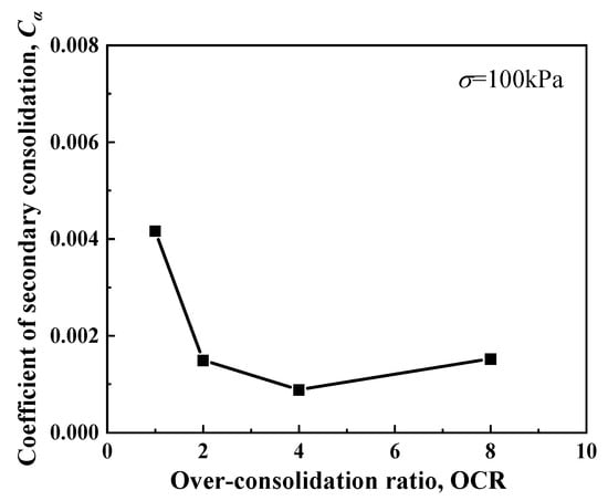 Figure 17 presents the relationship curve between the secondary consolidation coefficient and the OCR. When the OCR increases from 1 to 2, the secondary consolidation coefficient drops from 0.00416 to 0.00149, a decrease of 64.18%. The Cα calculation for all OCRs (including 2, 4, 8) adheres to the standard graphical method specified in ASTM D2435/D2435M-19 (Standard Test Method for One-Dimensional Consolidation Properties of Soils), which relies on the linear segment of the e-lgt curve during the secondary consolidation stage. For OCR = 2, 4, 8, the secondary consolidation stage in their respective e-lgt curves (Figure 16b–d) was first identified by two criteria: (1) the vertical deformation rate stabilized below 0.005 mm/h (indicating the end of primary consolidation), and (2) the e-lgt curve entered a near-linear segment (the hallmark of secondary consolidation.) after loading, where the curve transitions from the curved primary consolidation segment to a linear segment with a constant slope. As the OCR continues to increase, the secondary consolidation coefficient remains generally stable. This is mainly because when the OCR increases, the preconsolidation pressure on the soil increases, which significantly reduces the soil’s void ratio. This reduction in void ratio increases the frictional resistance between soil particles, thereby enhancing the soil’s cohesion and shear strength, and thus improving its resistance to deformation. Therefore, an increase in the OCR has a strong inhibitory effect on creep deformation. In practical engineering, overloading can be applied to soft soil foundations to reduce long-term settlement caused by creep. However, on the other hand, there is a limit value for the influence of the OCR on creep. When the OCR exceeds this limit value, the increase in overconsolidation has no significant effect on the secondary consolidation coefficient. The observed increase in the secondary consolidation coefficient at OCR = 8 is not consistent with the general mechanical trend of overconsolidated soils, which typically exhibit suppressed secondary consolidation with higher OCR. It is more likely attributed to experimental uncertainties in measuring subtle void ratio changes, transitional behavior near the influence limit of OCR, or soil-specific characteristics of remolded soft soil.
