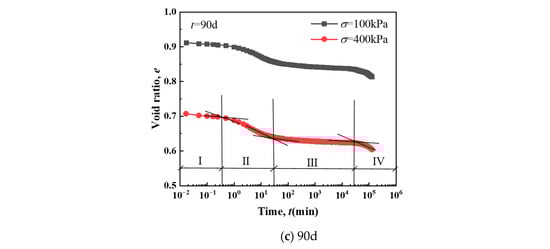 Figure 18 shows the e-lgt curves of remolded silt under various stress levels and loading durations. The 2-day loading exhibits near-linear creep-phase curves, indicating stable secondary consolidation coefficients. Extended loading to 30 days shows increased curve slopes after 11 days, demonstrating renewed coefficient growth. After 90 days, the coefficient continues increasing beyond 20 days. As Figure 18c illustrates, prolonged loading produces four distinct phases: I—instantaneous, II—primary, III—secondary, and IV—accelerated consolidation. The secondary consolidation phase clearly shows accelerating behavior, with progressively increasing curve slopes transitioning to accelerated creep. Quantitative measurements at 100 kPa reveal void ratio changes of 0.085 (2 days) and 0.102 (90 days), confirming that sufficiently long loading durations reactivate creep acceleration in silt.