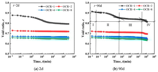 Figure 19 presents the e-lgt curves of remolded silt under different OCR at a constant stress of 100 kPa. The 2-day results (Figure 19a) show no tertiary creep stage, while the 90-day data (Figure 19b) reveal four distinct creep stages, demonstrating time’s significant influence on both normally consolidated and overconsolidated soils. After 90 days, the void ratio changes were 0.102 (OCR = 1), 0.0265 (OCR = 2), 0.025 (OCR = 4), and 0.025 (OCR = 8), confirming that higher OCR values correspond to reduced void ratio changes and less pronounced creep behavior.