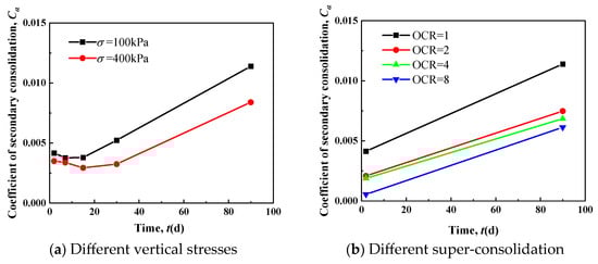 Figure 20 presents the relationship between the secondary consolidation coefficient and time for remolded silt. As shown in Figure 20a, the coefficient remains relatively constant within the first 20 days, then increases gradually, with accelerated growth between 30 and 90 days. For instance, at 100 kPa, it increases from 0.00522 (30 days) to 0.01139 (90 days); at 400 kPa, from 0.00324 to 0.00839. Figure 20b suggests similar time-dependent growth trends across different OCRs, though limited data points preclude definitive conclusions.