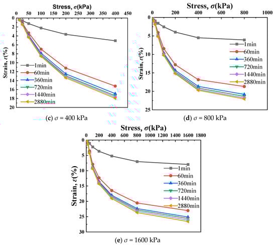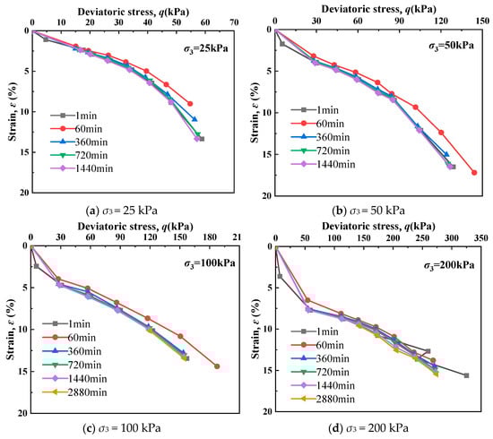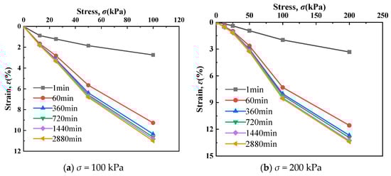 The strain values under different confining pressures and different eccentric stress states were selected at times of 1 min, 60 min, 360 min, 720 min, 1440 min and 2880 min, respectively. The time-dependent relationship curves of eccentric stress and axial strain were plotted as shown in Figure 24. It can be seen from the figure that the isochronous curves of eccentric stress–strain under different confining pressures show a certain degree of nonlinearity. However, at low confining pressures (25 kPa, 50 kPa), the isochrone relationship curve of eccentric stress and strain has no obvious yield point. As the confining pressure increases (100 kPa, 200 kPa), the isochrone curve shows inflection points when the eccentric stress is 25 kPa and 50 kPa, and yield occurs. Furthermore, as the confining pressure gradually increases, the isochronous relationship curve shows a transition from the stress axis to the strain axis, and the strain gradually flattens with the increase in stress, indicating that the reshaped silt has certain nonlinear creep characteristics.