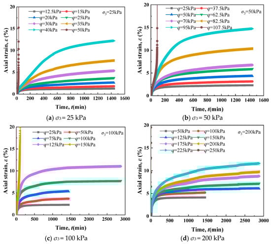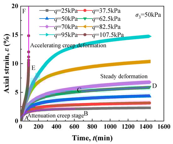 Figure 22a–d present the axial strain–time curves under confining pressures of 25, 50, 100, and 200 kPa, respectively, showing three creep phases: primary (decelerating), secondary (steady), and tertiary (accelerating). As exemplified by the 50 kPa case (Figure 22b), these phases exhibit distinct characteristics: primary creep (segment AB) with decreasing strain rate under low stress; secondary creep (CD) with constant rate at moderate stress; and tertiary creep (EF) with increasing rate leading to failure under high stress. Notably, under extreme stress, specimens may directly enter tertiary creep until failure.